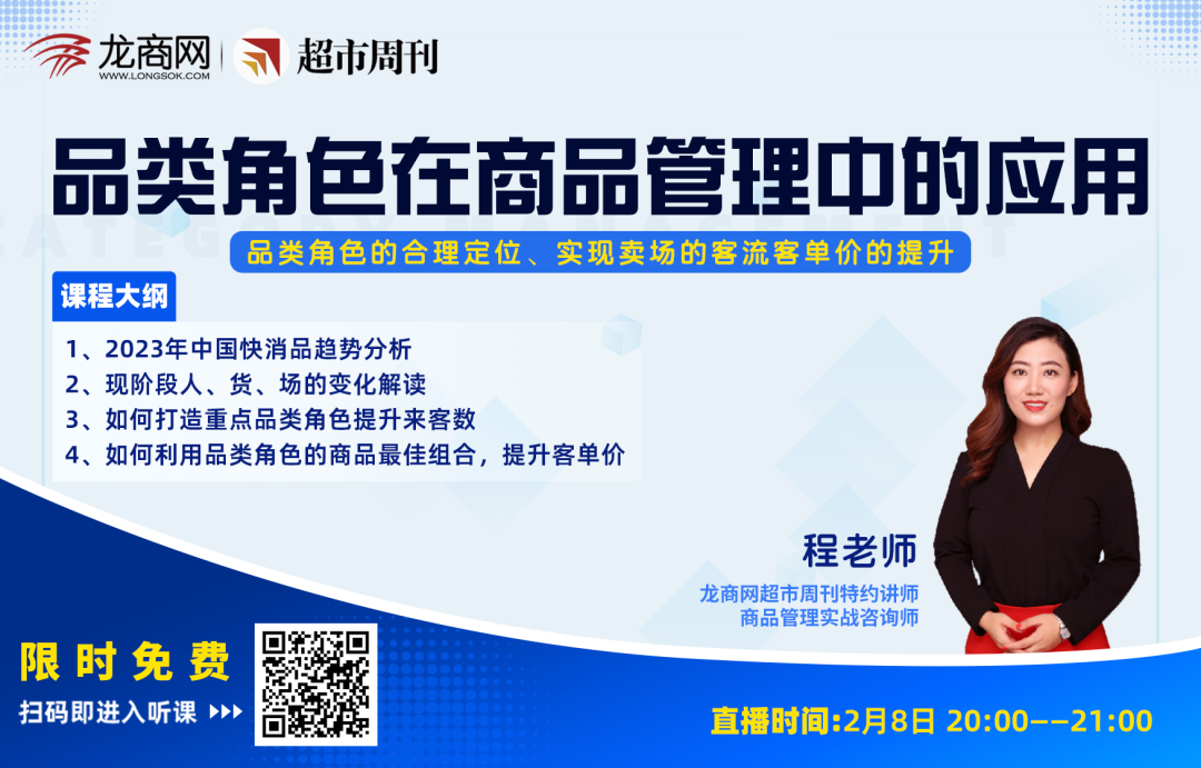 时间:2月8日 20:0021:00 要点:品类角色在商品管理中的应用 1、2023年中国快消品趋势分析 2、现阶段人、货、场的变化解读 3、打造重点品类角色提升来客数 4、利用品类角色的商品最佳组合,提升客单价 实战老师,只讲干货 商品管理,有效提升 扫描预约,准...