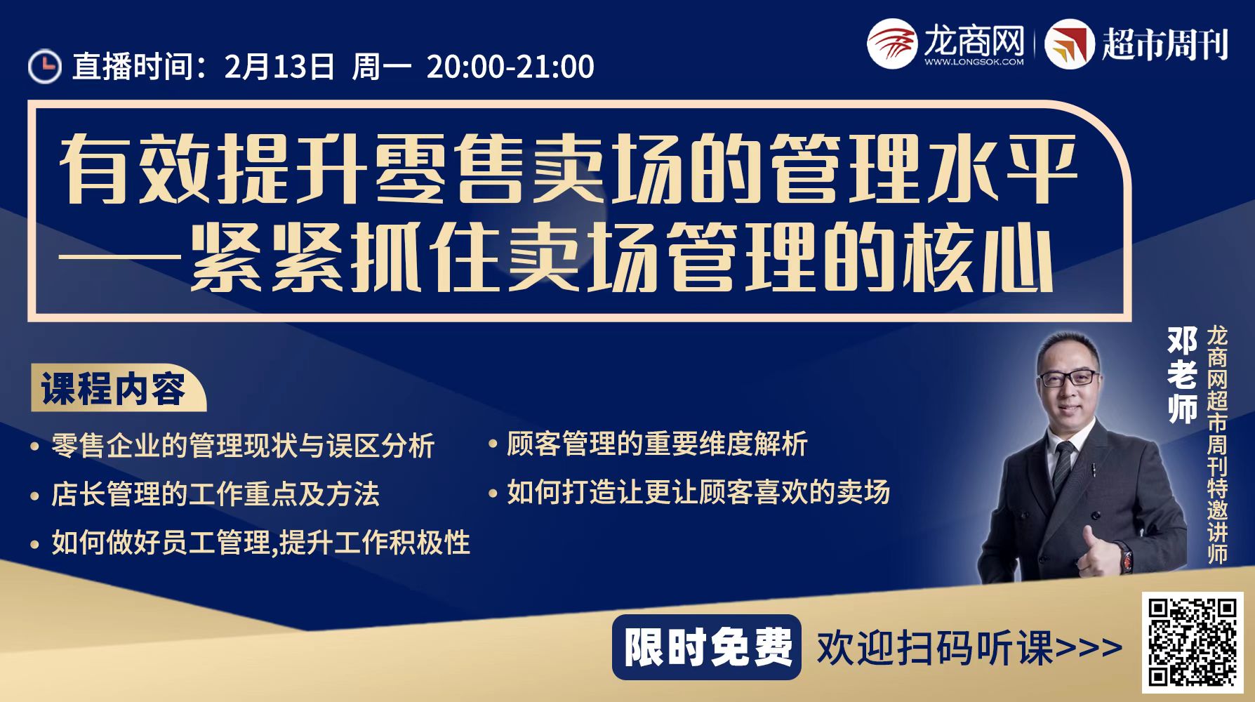 课程:限时免费课程内容: 1、零售企业的管理现状与误区分析 2、店长管理的工作重点及方法 3、如何做好员工管理的提升工作积极性 4、顾客管理的重要维度解析 5、如何打造让更让顾客喜欢的卖场 扫码预约课程,欢迎准时学习...