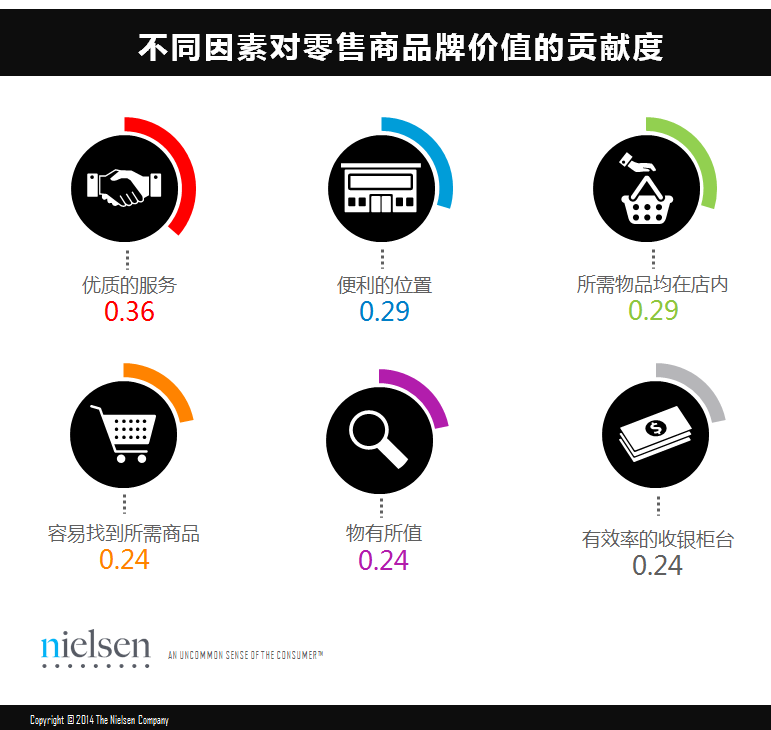 尼尔森调查显示,“便利的位置”对于零售商品牌价值的贡献度紧随“优质的服务”之后,位居第二。其次是“可以很容易、并很快找到我需要的东西”,“能在一个门店找到我想要的所有东西”、及“有效率的收银柜台”。值得一提的是,能够提供“所需物品均在店内”服务的零售店的排名从前一年的第13位一跃成为排名第4的品牌价值影响要素,与此同时,“有效率的收银柜台”也从去年的第15名跃居为如今的第6名。