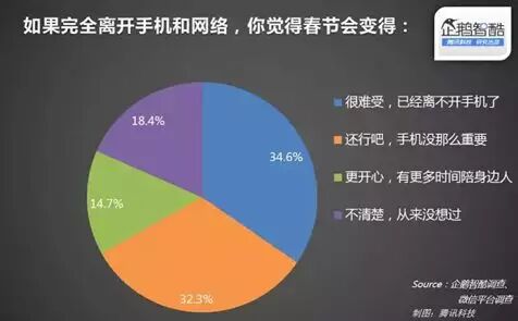 企鹅智酷调查显示,当我们让用户假设一个没有网络和手机的春节时,34.6%的大众网民表示会“很难受”,完全无法想象没有网络和手机的生活。
