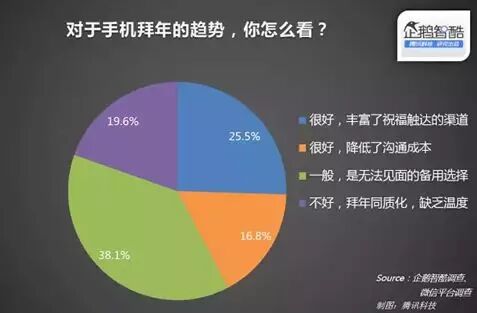 对于手机拜年行为的讨论,持认同意见的用户占比为42.3%,觉得无所谓的用户占比约为38.1%。而反对手机拜年,更青睐传统拜年方式的用户,占比约为19.6%。