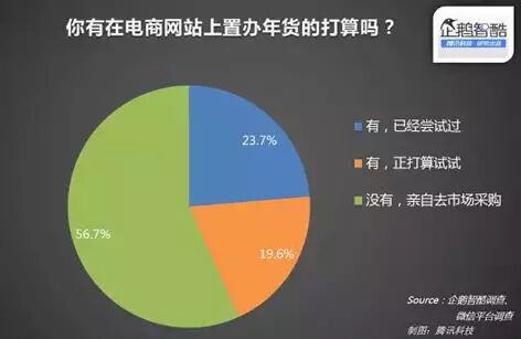 在我们的调查中显示,23.7%的网民已经尝试过通过网络购买年货;而尚无此类经验,但打算就此尝试的用户占比19.6%;完全没有网购年货打算的用户,占比为56.7%。