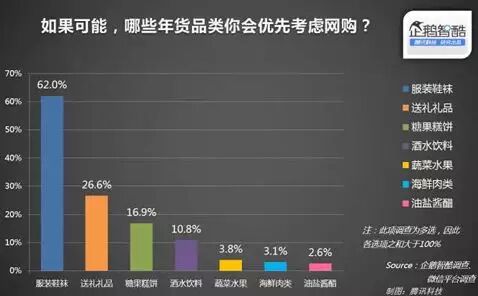 具体到网购年货的品类选择,则呈现出明显的趋向性。服装鞋袜成为网购年货的主力军,渗透率高达62%,而礼品和糖果糕饼也比较受到欢迎。