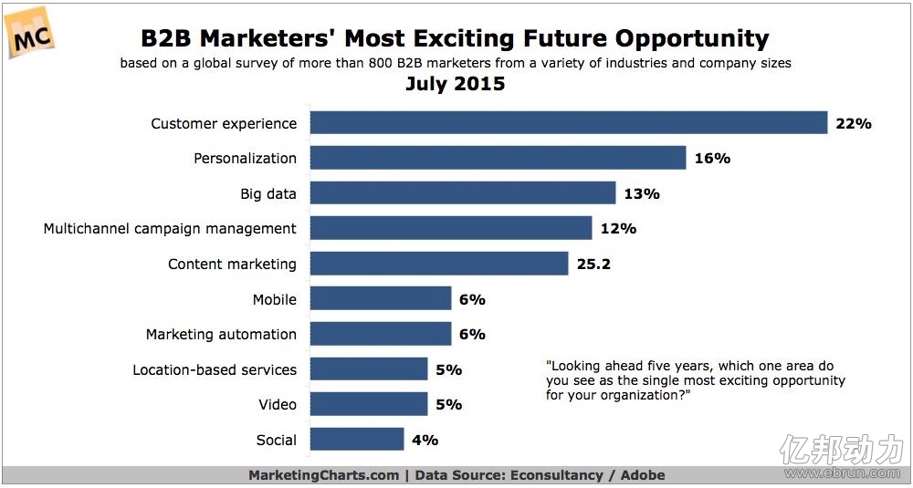 内容营销也许是B2B营销人员当前最大的机遇,但是根据Econsultancy和Adobe的新报告,未来几年内容营销的吸引力将逐渐消退,不敌其他令人振奋的机遇。消费体验(CX)将成为最让B2B,甚至B2C营销人员振奋的机会。