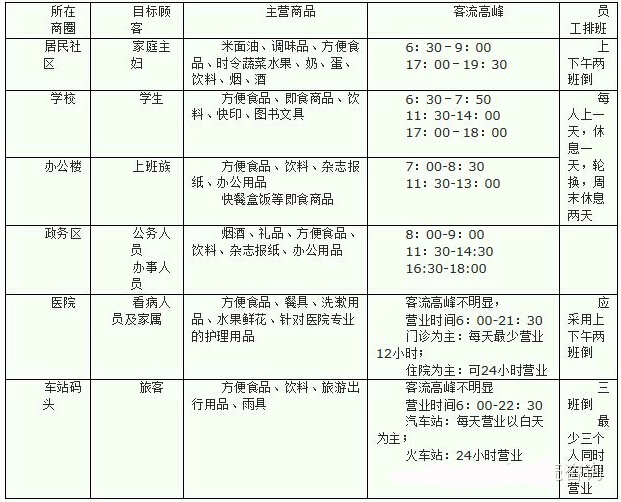 假设员工交通方便,就近上班。要根据便利店所在的商圈、目标顾客来确定排班情况。举例来说,如果学校是8:00开始上学,12:00中午放学,下午14:00上学,17:00放学,办公区上班时间是8:30到17:30,中午12:00-13:30休息;政务区是早上9点上班,中午12:00-14:00休息,下午17:00下班,就可以按下表来进行排班。