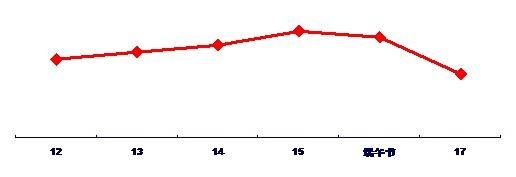 2.订货时要懂得根据商品的季节变化随机应变,还要知道每月重点营销的商品有哪些。顾客在重要节庆前后的消费习惯,关注重要节日期间商品的销售走势。比如端午节我们需要吃粽子,那么就要知道包粽子需要的材料,如糯米(江米)、红枣、白糖、粽叶等就需要加大订货量。但是从端午节过后第二天开始,此类单品就会急速降低销量,特别是粽叶几乎无人问津。所以订货时要注意预估节前销量和节后走势。下图是2012年某企业的糯米(江米) 在端午节前后的销售走势(仅供参考)。