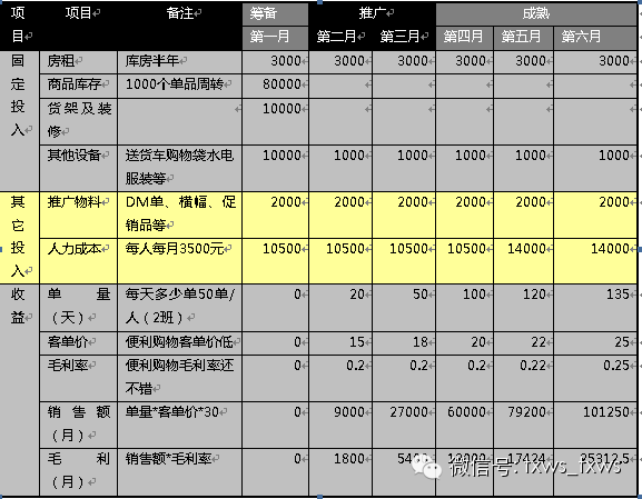 此表假设的关键数据有:库房房租3000元/每月,推广费用2000元/每月,人力成本3500元/月,成熟期单量135单/天,成熟期客单价25元/单,成熟期毛利率25%。