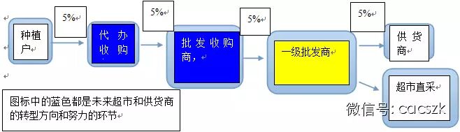 够直观了吧!每道环节我按照5%的利润收取,这个5%已经是很薄利、很良心了,实际操作中有10%至20%之间的利润差在每道农产品环节,图中的一级批发商是目前大多数超市发生交易的环节。