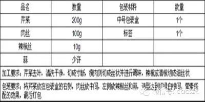 配菜的种类主要有素配菜、荤配菜、特色配菜等,配菜的加工方法有很多,可以炒、炖、煮、蒸等。配菜是近几年来发展起来的,由于它方便、干净、品种多,越来越受到市场的欢迎和消费者的认同。配菜一般以配方表为准来制作,举例如下: