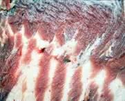 ②暗红色或灰褐色,脂肪呈黄白、 绿色或黑色表示已经腐败;