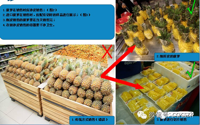 菠萝陈列标准以及菠萝简易切削方式:1.菠萝在销售时应净皮销售;2.进口菠萝在销售时,应配有切好的样品进行展示;3.剥皮销售的菠萝要在当天销售完;4.存放净皮销售的容器要干净卫生。...