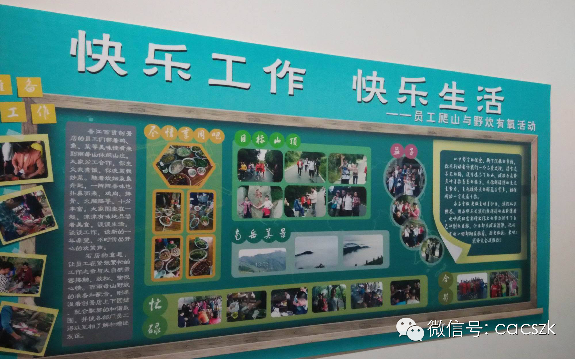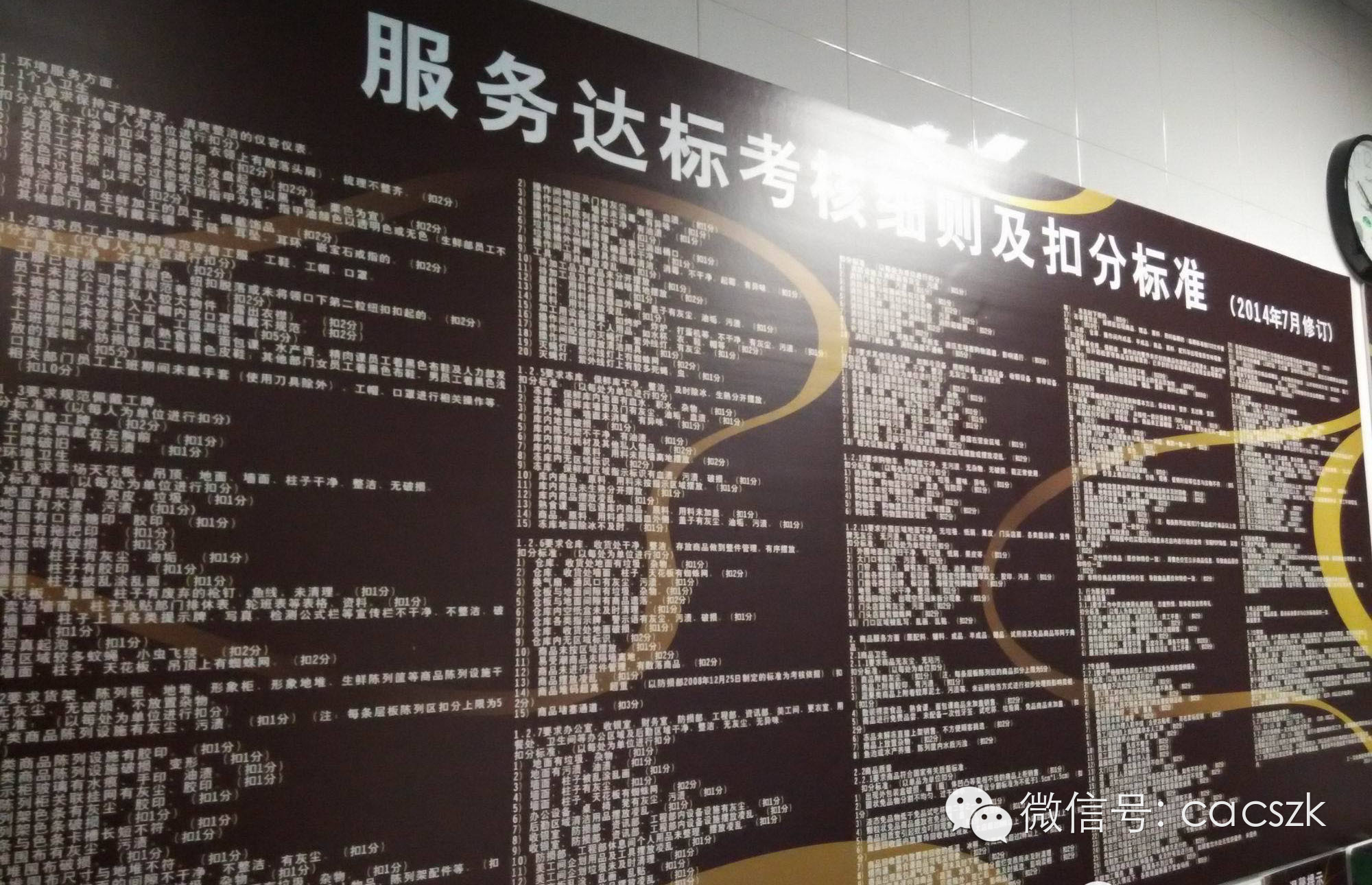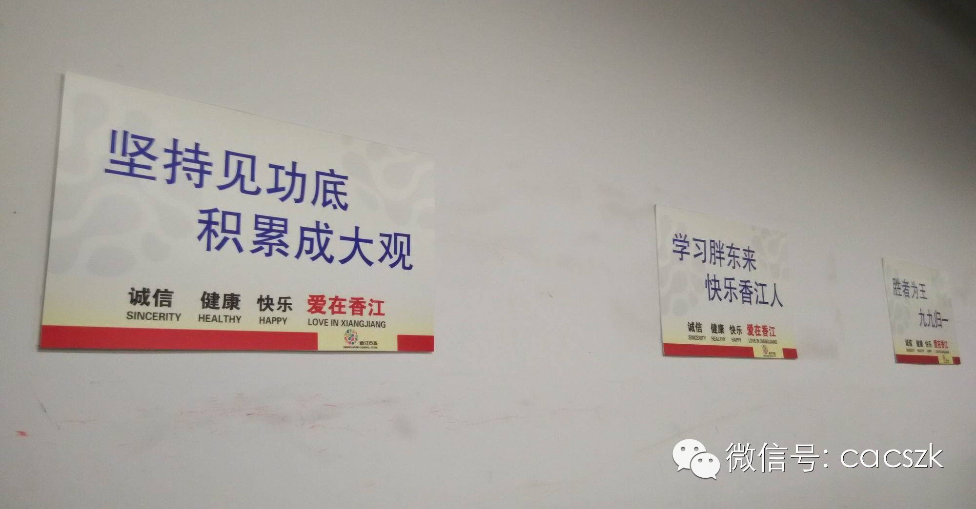 这是岳屏店的仓库,走廊的墙壁上贴着规章制度、员工文化生活照片及各种标语口号。