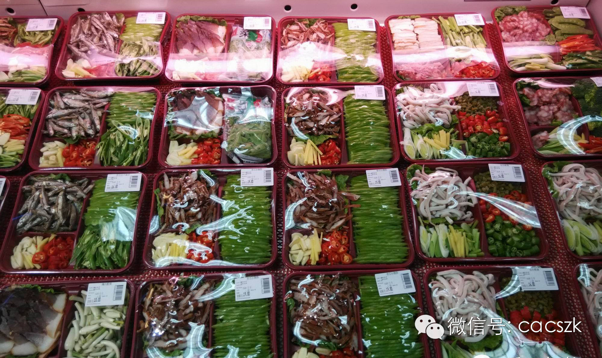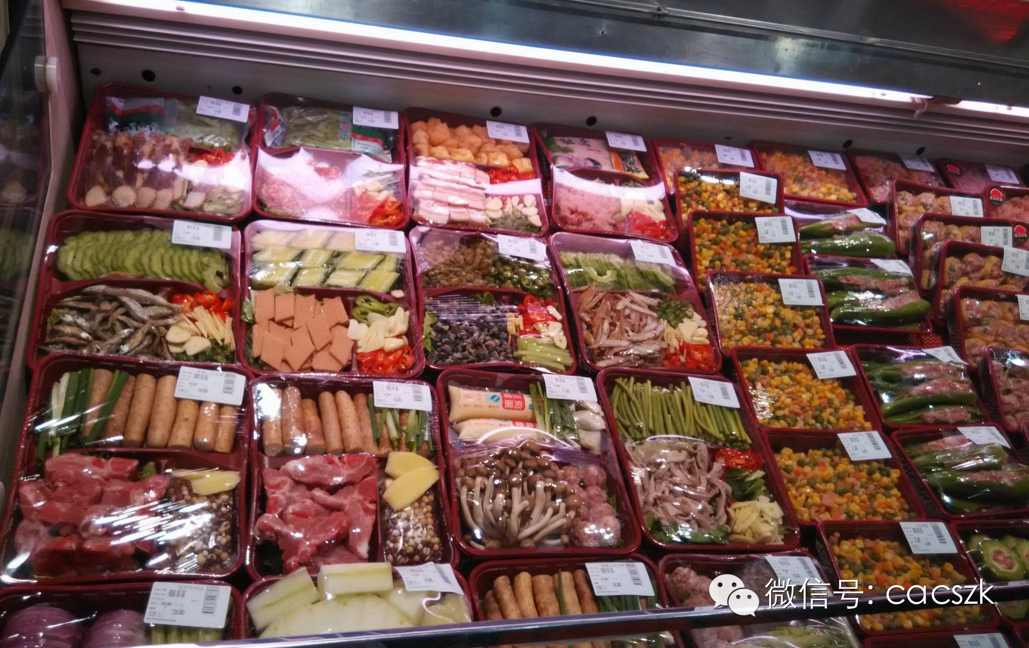 在蔬菜区,所有的茎菜全部是用环保胶带包起来的,叶菜也是用保鲜膜包住的,表面上这增加了物料成本及员工的工作量,但实际上这些措施都大大降低了生鲜的损耗率,即使会有一些耗损,香江的员工食堂也能消化一部分。其他的菜品也被陈列的非常整齐。