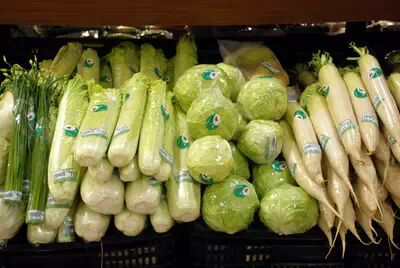 4、所有商品加工清洁后再陈列,将发黄腐烂的菜叶去掉,花菜类去根后剩2公分,萝卜类、调味类毛根毛叶去掉,西葫芦、茄子、椒类去把,鲜银针菇去黑根;