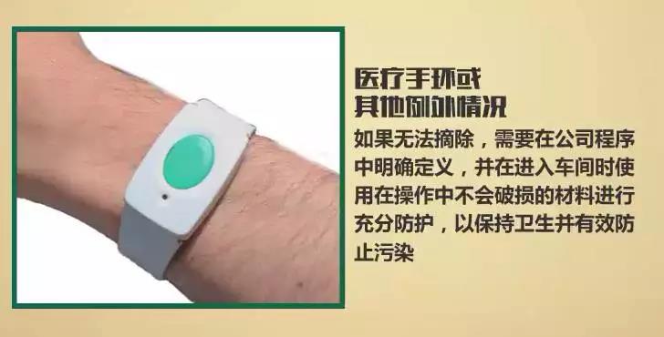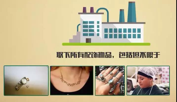 进入车间需要取下所有配饰物品,包括但不限于手表、项链、戒指、耳环等,此类物件可能掉入食物、设备或容器中造成污染,而且手上的首饰还可能造成双手消毒不彻底而在操作食物时污染食物。