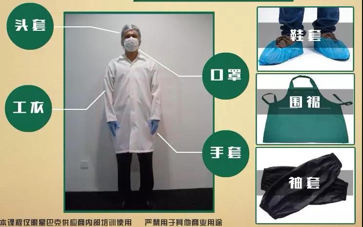 工作防护服包括工衣、鞋套、围裙、袖套、头套、口罩、手套等,选择的材料适宜清洁,在设计上应注意在工作服腰部以上的部位不应留有口袋,以避免放置的物品掉落到产品中。