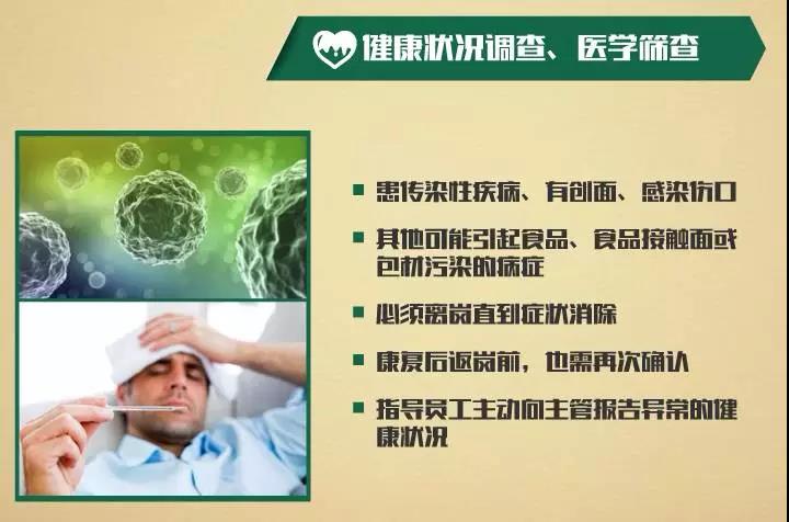任何人患传染性疾病、有创面、感染伤口或其他可能引起食品、食品接触面或包材污染的病症,必须离岗直到症状消除。