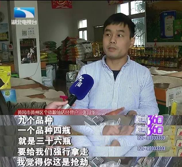 12月23日《新闻360》栏目播出了这样一条调查新闻——在黄冈市黄州区,一位食品药品监督执法人员在执法过程中,以“样品调查”为由,从一家小商店一次性拿走了36瓶食用油。由于这位执法人员没有提供产品质量存在问题的确实依据,面对如此执法,商店老板张月华情急之下说:“你这是抢劫!”