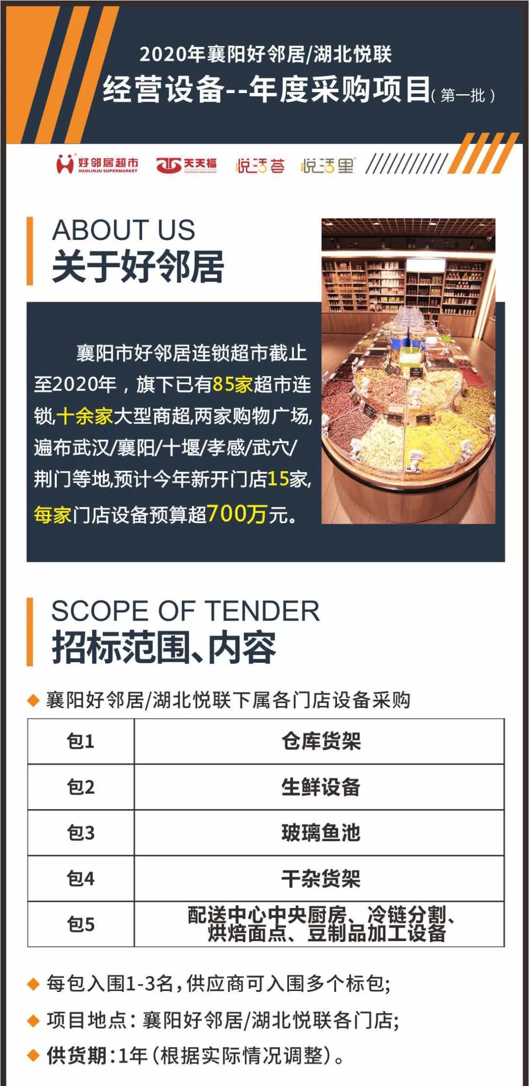 龙商网&超市周刊讯 (王跃霞 北京报道)近日,湖北襄阳好邻居启动2020年度采购项目,采购设备包括仓库货架、生鲜设备、玻璃鱼池、干杂货架、配送中心中央厨房、冷链分割、烘焙面点、豆制品加工设备等。