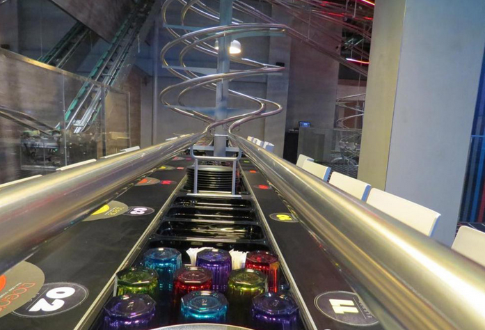 该餐厅名为 ROGO's,餐厅内每张餐桌都配备有专门为其设计的过山车轨道,共 30 多条,客人通过智能终端点餐,装在密闭容器中的食物通过这些过山车轨道被投递到客人的餐桌上。轨道上的传输系统保证了食物运输途中的零噪音,全程自动化操作,非常便捷高效。