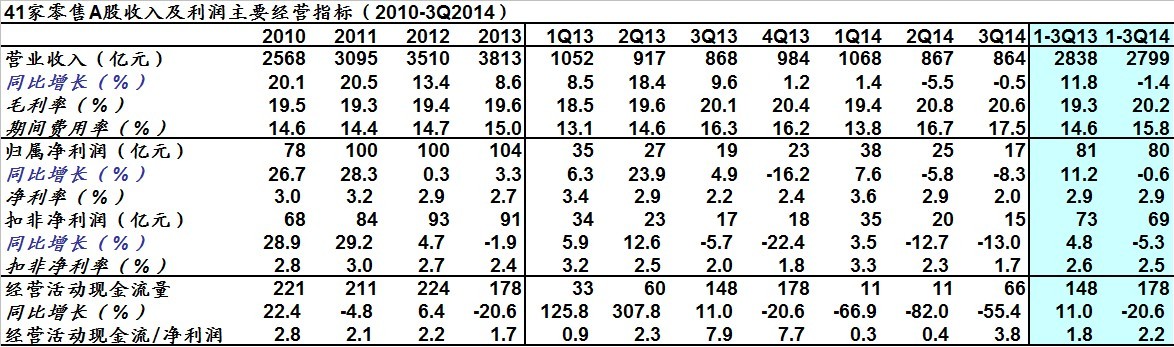 41家零售A股Q3收入增速环比略好转,毛利率同比继续提升、费用率增幅较大,扣非净利仍与Q3下降幅度类似。(1)41家零售公司1-3Q14收入降1.39%,3Q14降0.5%,环比较二季度好转,预计4Q在低基数上增速回升;(2)1-3Q14毛利率同比增0.87个百分点,一、二、三季度各同比提升0.95、1.18和0.5个百分点,反映实体零售依然有较强议价能力;(3)1-3Q14销管费用率增1.21个百分点,各季均有增加,主因主要费用项刚性上涨而收入下降,预计4Q随收入增速回升,费用压力缓解;(4)1-3Q14扣非净利降5.34%,仅一季度增长3.53%,二、三季度各降12.73%和13%,行业经营压力继续加大。