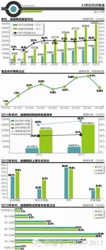数据显示,2013年农村宽带人口普及率仅为6.3%,低于城镇12.6个百分点,2013年农村网民网上购物使用率为31.1%,网上支付使用率为25.7%,分别比城镇低24.1和22.2个百分点。这也意味着农村人口虽多,但很大一部分是未激活用户。
