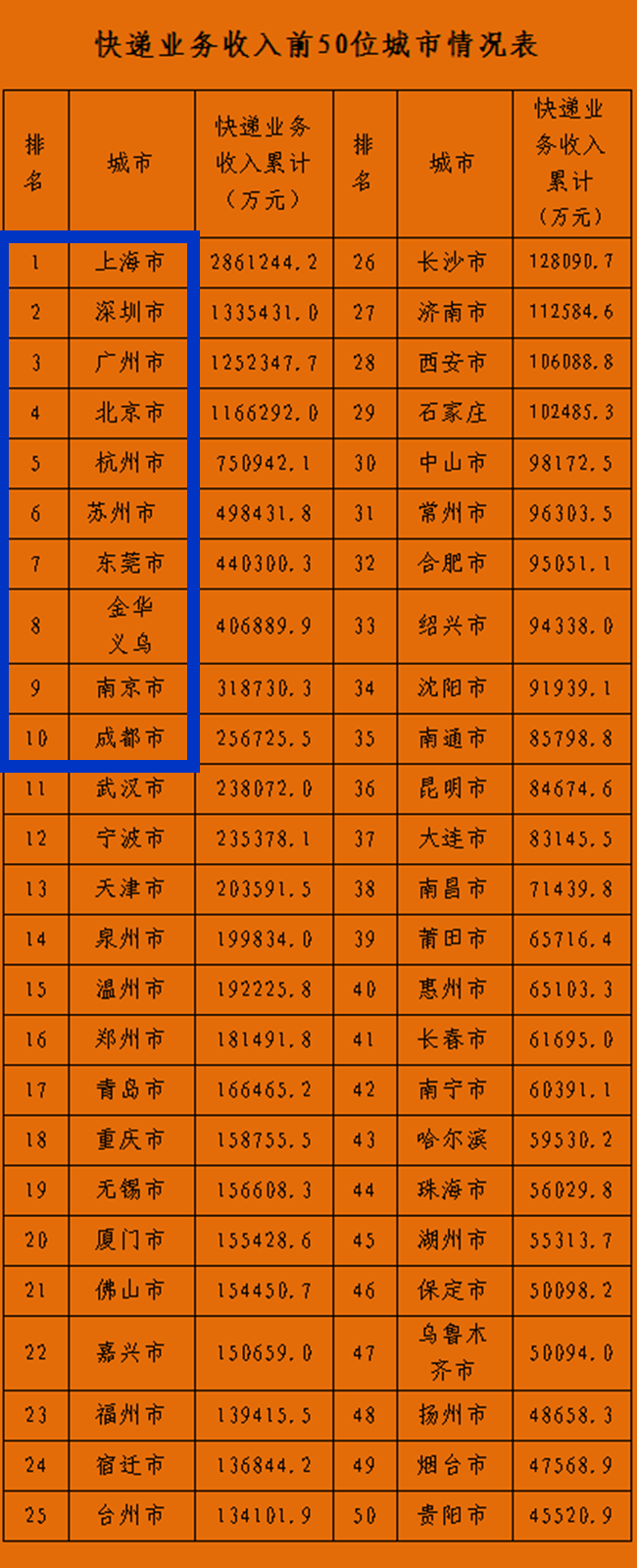 1-10月份,全国快递服务企业业务量累计完成106.8亿件,同比增长51.9%;业务收入累计完成1592.6亿元,同比增长41.5%。其中:同城业务收入累计完成201.3亿元,同比增长54.3%;异地业务收入累计完成879.5亿元,同比增长37.1%;国际及港澳台业务收入累计完成253.7亿元,同比增长16.6%。