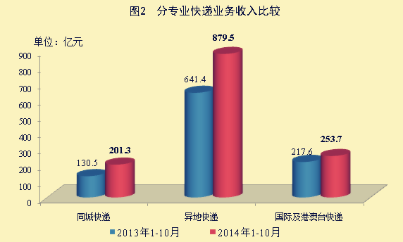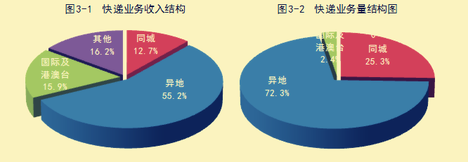 1-10月份,同城、异地、国际及港澳台快递业务收入分别占全部快递收入的12.7%、55.2%和15.9%;业务量分别占全部快递业务量的25.3%、72.3%和2.4%。与去年同期相比,同城快递业务收入的比重上升1.1个百分点,异地快递业务收入的比重下降1.8个百分点,国际及港澳台业务收入的比重下降了3.4个百分点。
