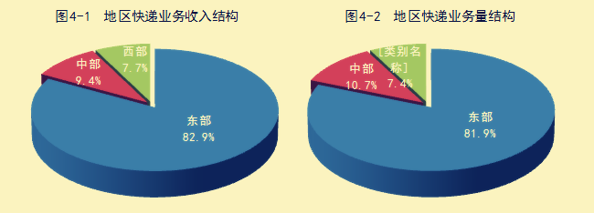 1-10月份,东、中、西部地区快递业务收入的比重分别为82.9%、9.4%和7.7%,业务量比重分别为81.9%、10.7%和7.4%。与去年同期相比,东部地区快递业务收入比重下降了0.2个百分点,快递业务量比重上升了0.6个百分点;中部地区快递业务收入比重上升了0.2个百分点,快递业务量比重下降了0.1个百分点;西部地区快递业务收入比重持平,快递业务量比重下降了0.5个百分点。