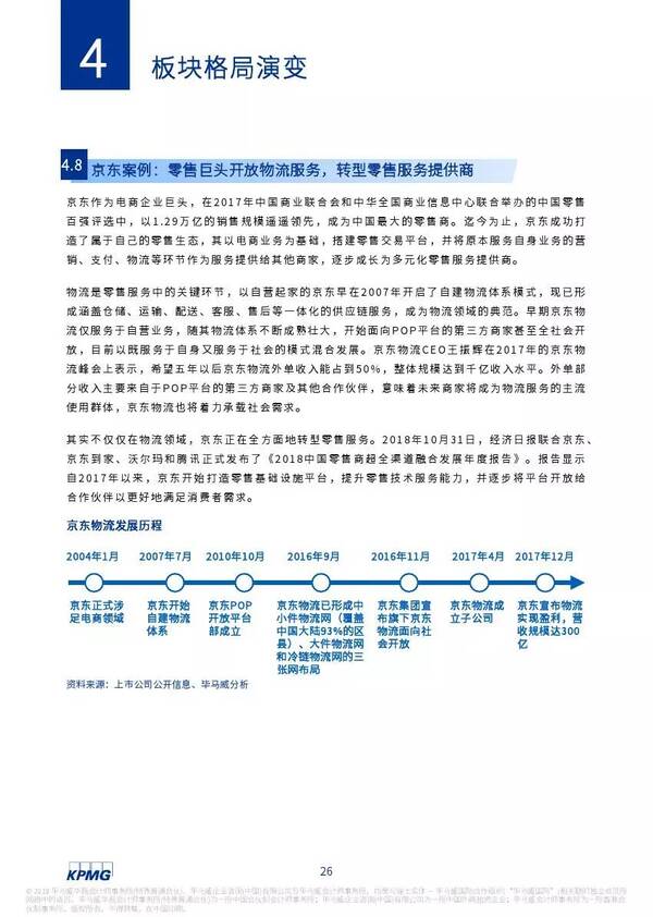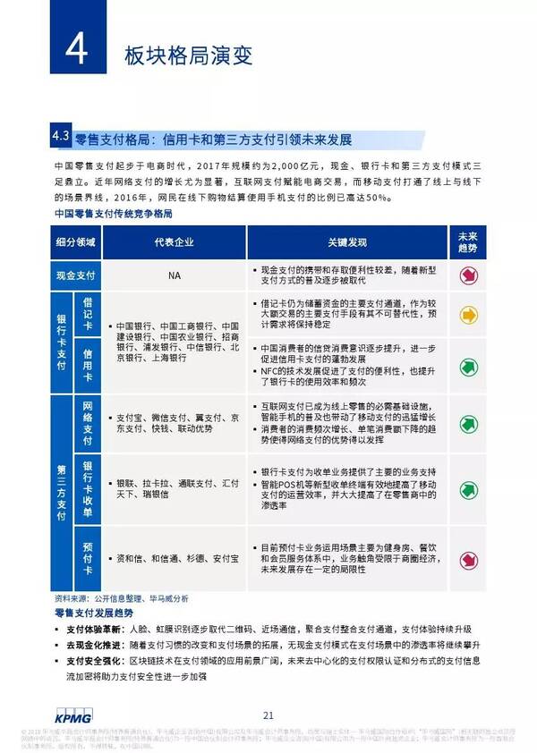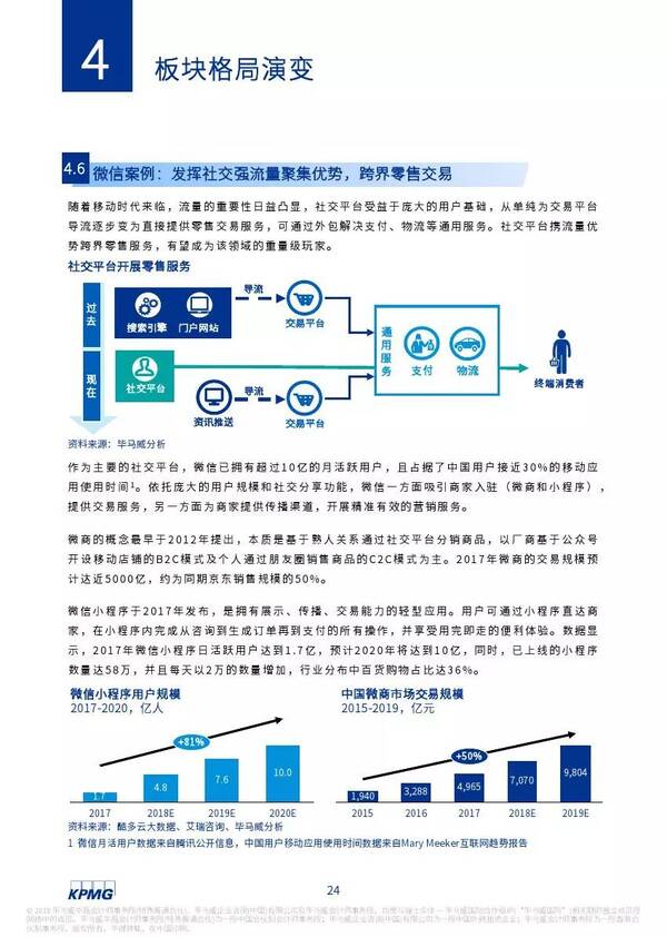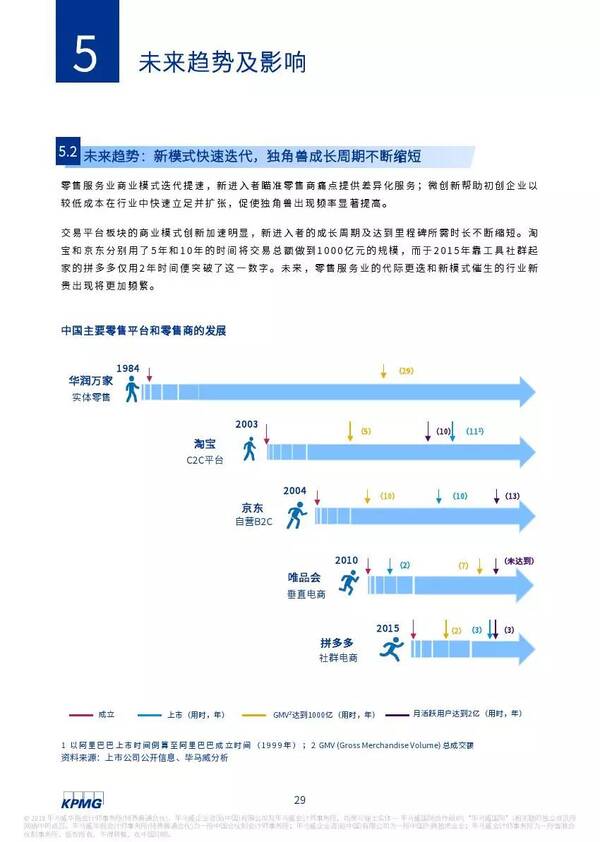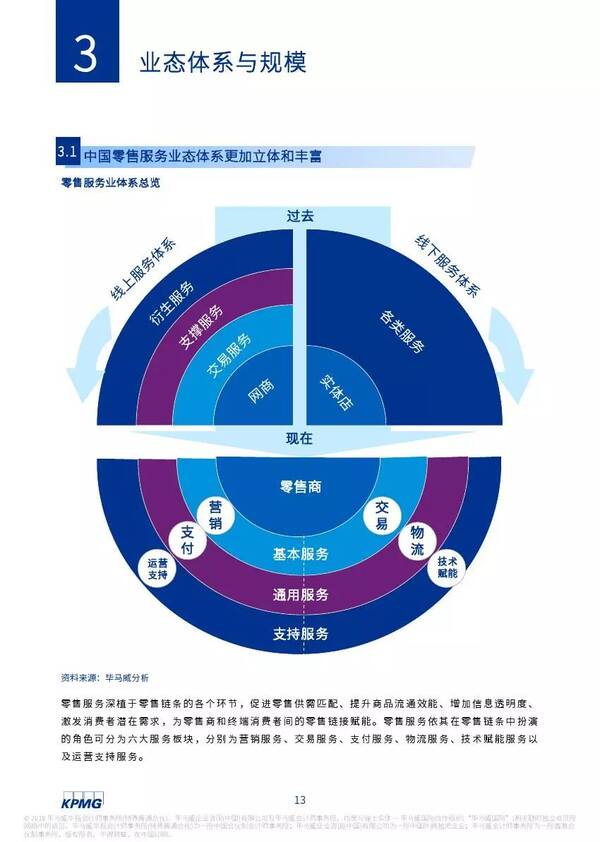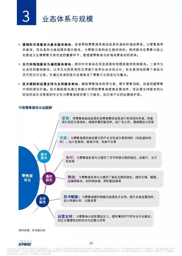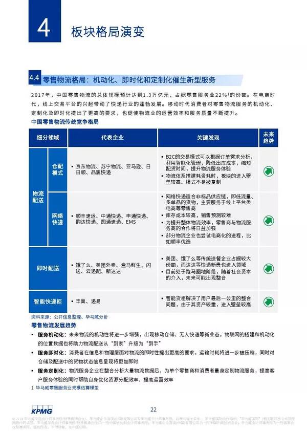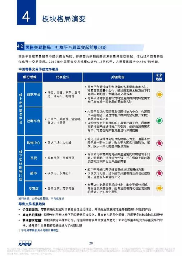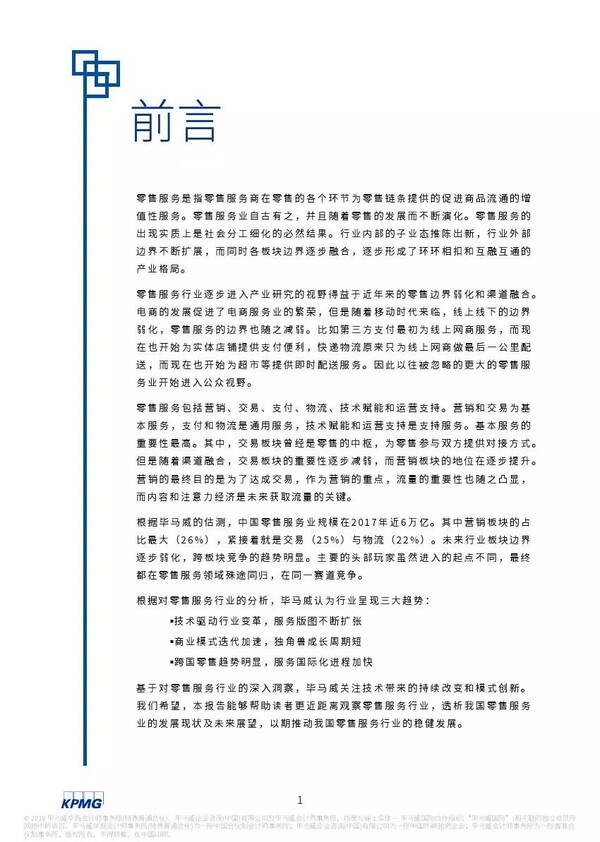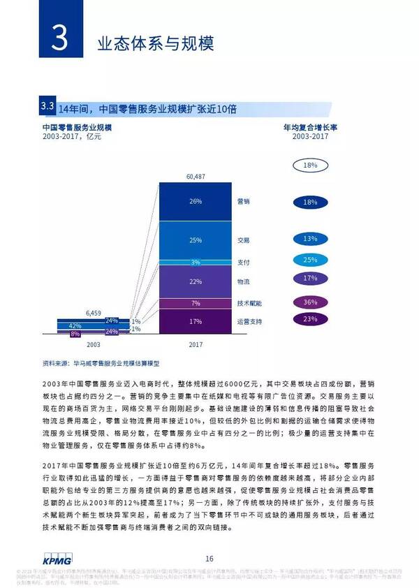 据毕马威估测,中国零售服务的市场规模在2017年近6万亿。在过去14年间的复合增长率超过17%,其中营销板块的占比最大(26%),紧接着就是交易(25%)与物流(22%)。由于 未来市场边界逐步弱化,跨板块竞争的趋势明显。主要的头部玩家虽然进入市场的起点各有区别,最终都在各零售板块中殊途同归,在同一赛道竞争。 毕马威中国零售消费行业数字化服务合伙人毛健表示:目前零售服务行业呈现出三大趋势,技术驱动行业变革,服务版图不断扩张,信息技术的革新推动了营销服务细分板块的扩展。商业模式迭代加速,独角兽成长周期短,交易板块的商业模式创新加速明显。服务赛道不断扩充,新物种多样性提升,多元化的市场参与者共同筑建了一个全面的零售服务生态体系,形成一个综合的竞合关系网络。跨国零售趋势明显,服务国际化进程加快。消费升级为跨境零售的发展奠定了良好的基础,而服务商突破地域限制,通力合作,为商家和消费者提供全球化的零售服务。
