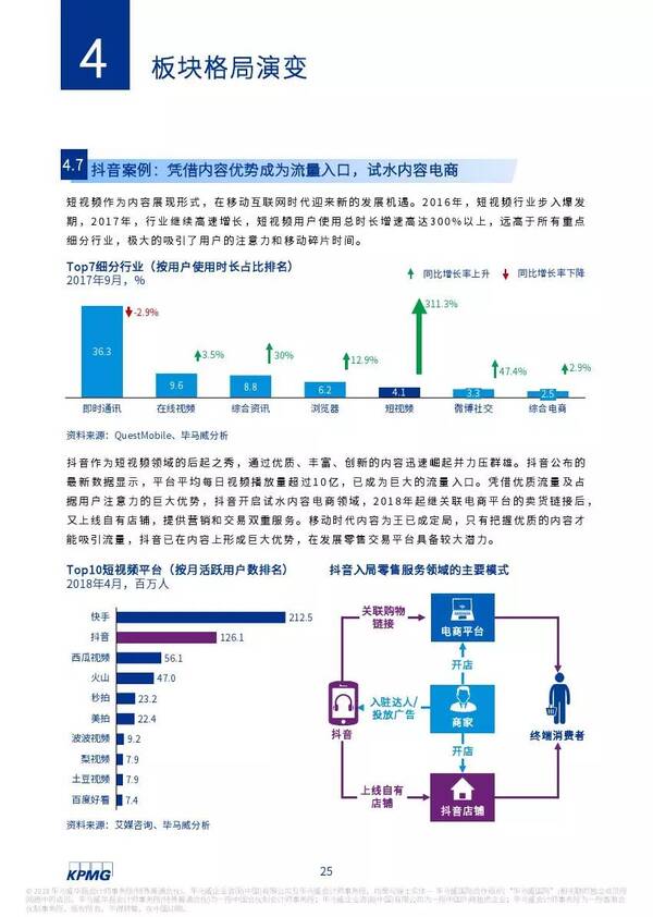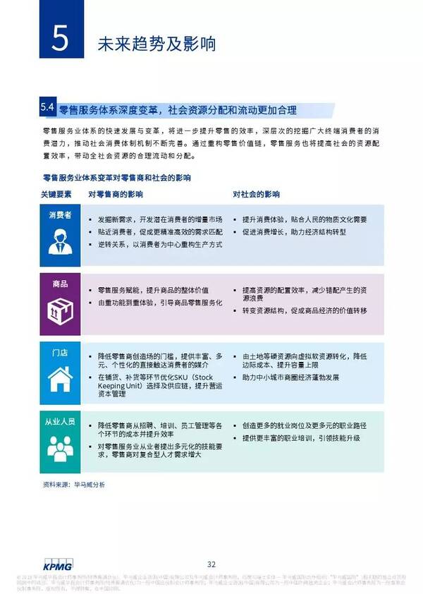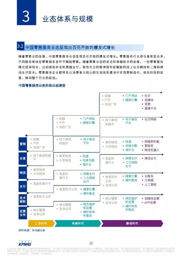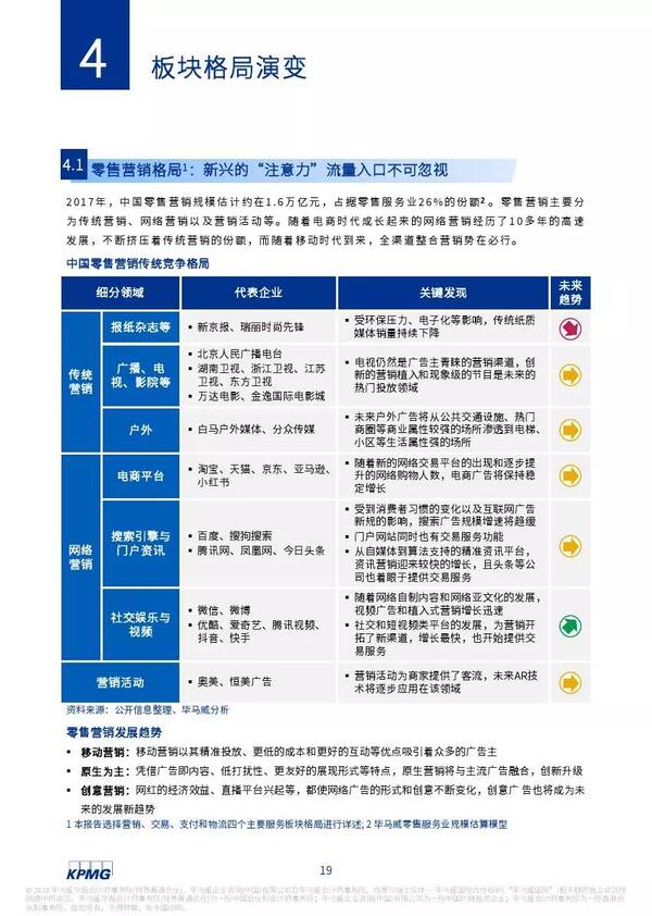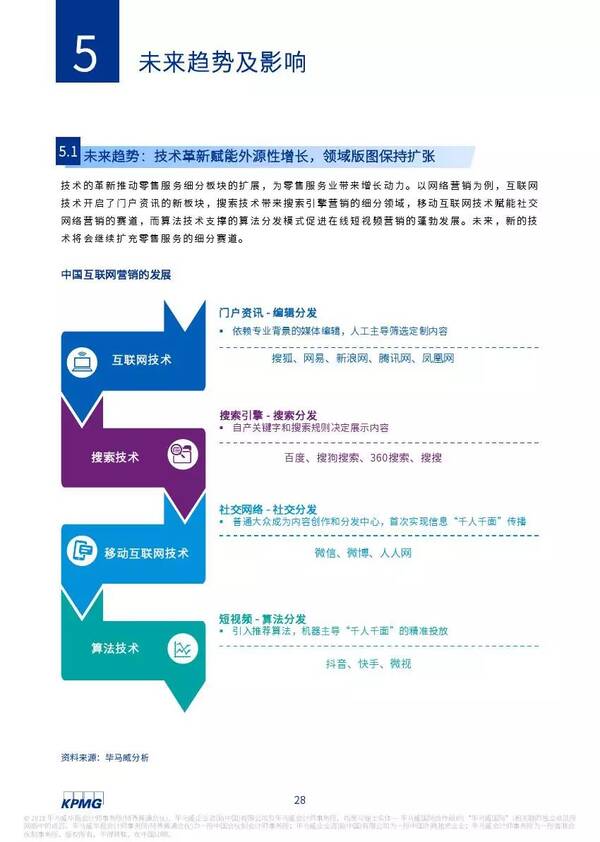 毕马威中国零售消费行业咨询业务主管合伙人林伟表示:在当今的零售服务市场,跨界布局和竞争已经成为常态,市场的边界越来越模糊。当零售服务细分领域领先者占据一定优势地位和资源后,纷纷跨界进入其他零售服务板块。技术的革新推动零售服务细分板块的扩展,为零售服务市场带来增长动力。以网络营销为例,互联网技术开启了门户资讯的新板块,搜索技术带来搜索引擎营销的细分市场,移动互联网技术赋能社交网络营销的赛道,而算法技术支撑的算法分发模式促进在线短视频营销市场的蓬勃。未来,新的技术将会继续扩充零售服务的细分赛道。
