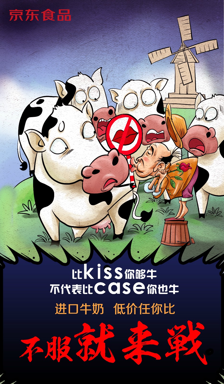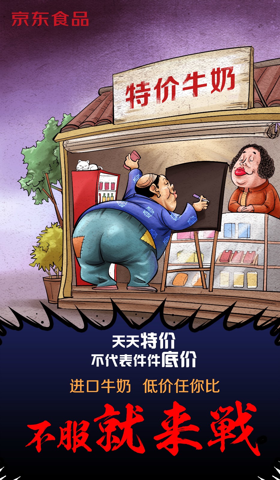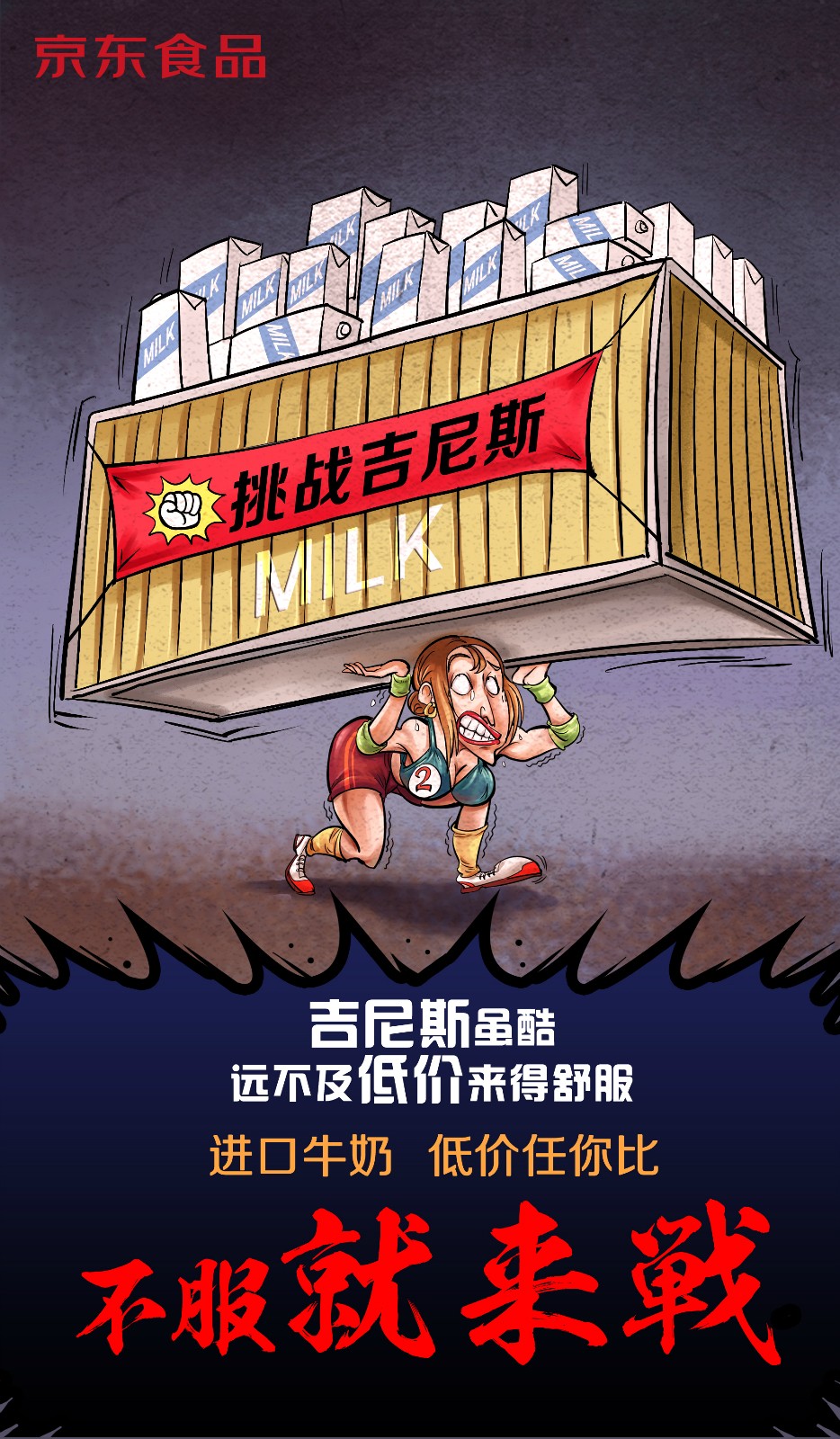近日,京东食品曝光了一组以“不服就来战”为主题的漫画。漫画主要讲京东进口牛奶售价全网最低,有不服的随时比价。