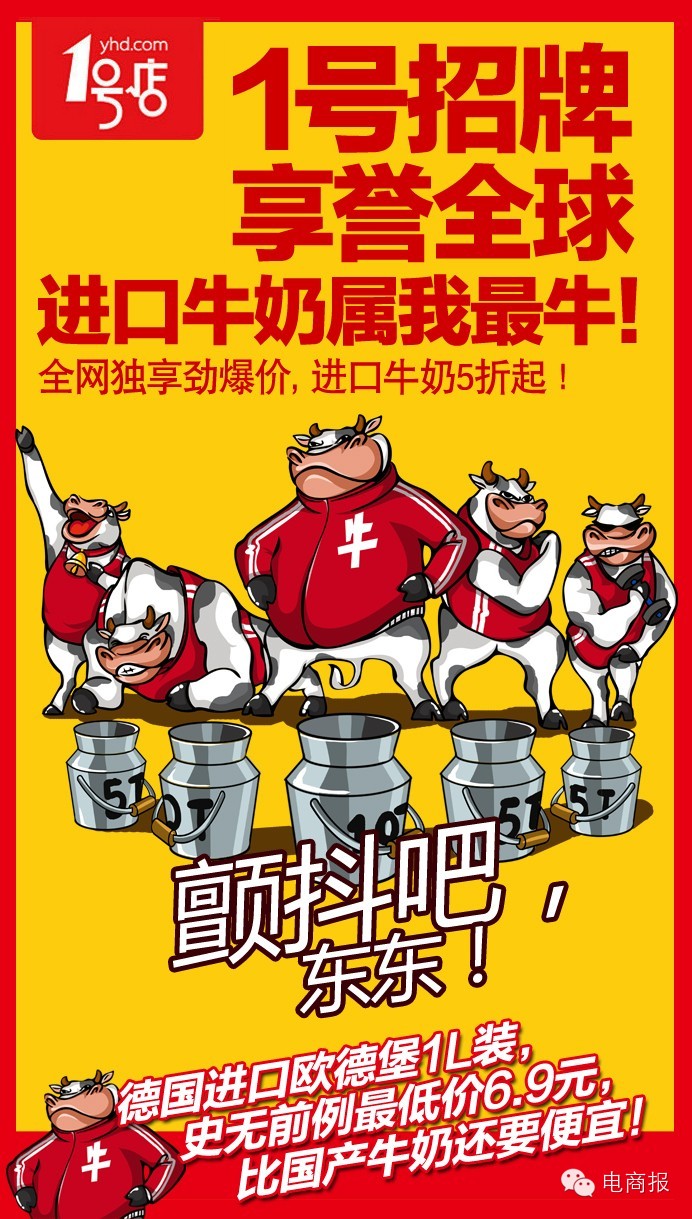 近日,京东食品曝光了一组以“不服就来战”为主题的漫画。漫画主要讲京东进口牛奶售价全网最低,有不服的随时比价。不过漫画中提到的“史无前例”、“不二之选”以及“吉尼斯纪录“等词都是1号店之前的宣传文案。让人不禁疑问:京东食品要跟1号店展开撕逼大战...