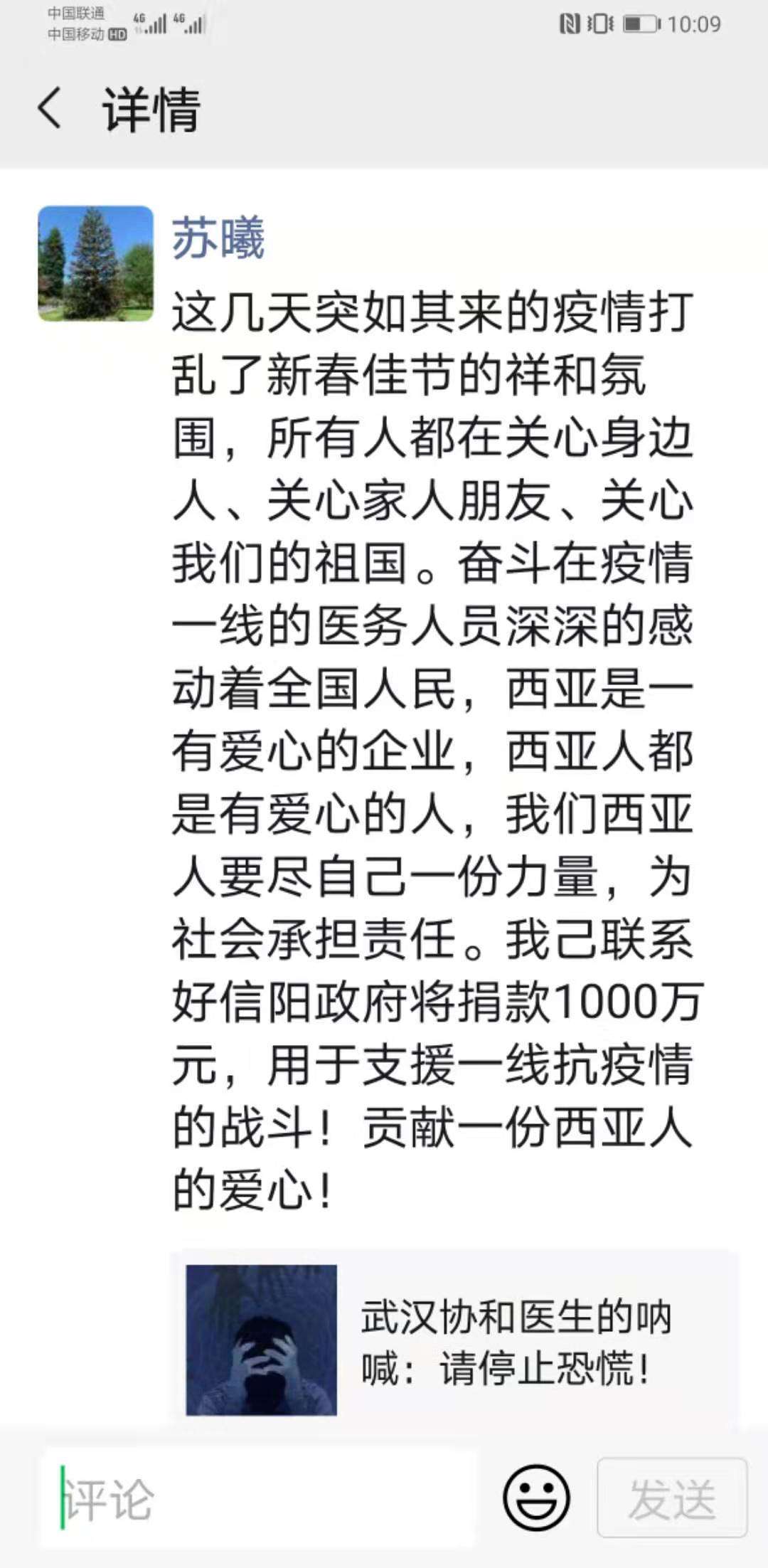 龙商网消息:1月26日,信阳西亚董事长苏曦在其朋友圈表示,这几天突如其来的疫情打乱了新春佳节的祥和氛围,所有人都在关心身边人、关心家人朋友、关心我们的祖国,奋斗在疫情一线的医务人员深深的感动着全国人民,西亚是一个有爱心的企业,西亚人都是有爱心的人,我们西亚人要尽自己一份力量,为社会承担责任。信阳西亚已联系信阳政府将捐款1000万元,用于支援一线抗疫情的战斗,贡献一份西亚人的爱心。