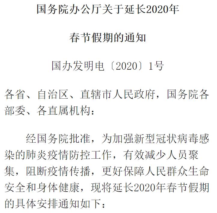 经国务院批准,为加强新型冠状病毒感染的肺炎疫情防控工作,有效减少人员聚集,阻断疫情传播,更好保障人民群众生命安全和身体健康,现将延长2020年春节假期的具体安排通知如下: