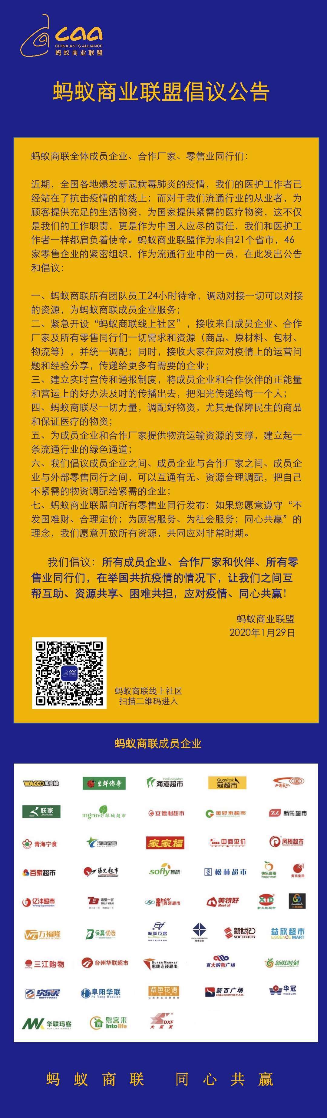 近期,全国各地爆发新冠病毒肺炎的疫情,我们的医护工作者已经站在了抗击疫情的前线;而对于我们流通行业的从业者而言,为顾客提供充足的生活物资,为国家提供紧需的医疗物资,已不仅是我们的工作职责,更是作为中国人应尽的责任,我们和医护工作者一样都肩负着使命。蚂蚁商业联盟作为来自21个省市,46家零售企业的紧密组织,作为流通行业中的一员,在此发出公告和倡议: