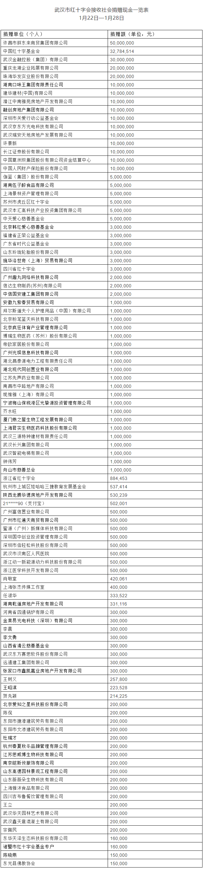 注:以上为大额捐赠单位(个人)明细,其它捐赠明细请登陆武汉市红十字会官网查询。