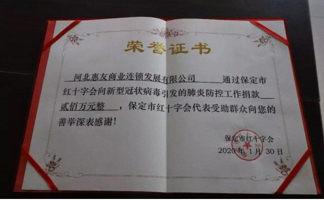 龙商网&超市周刊消息(DF报道):新型冠状病毒发现至今,疫情防控工作异常艰巨。医护人员以及奋战在一线岗位的工作者们,用他们的专业能力和职业操守,守护着百姓的生命与健康。惠友集团作为河北本土企业,积极承担社会责任,做好保供工作。惠友集团董事长张健决定:向保定红十字会捐赠人民币200万元,用于保定市疫情防疫相关工作。
