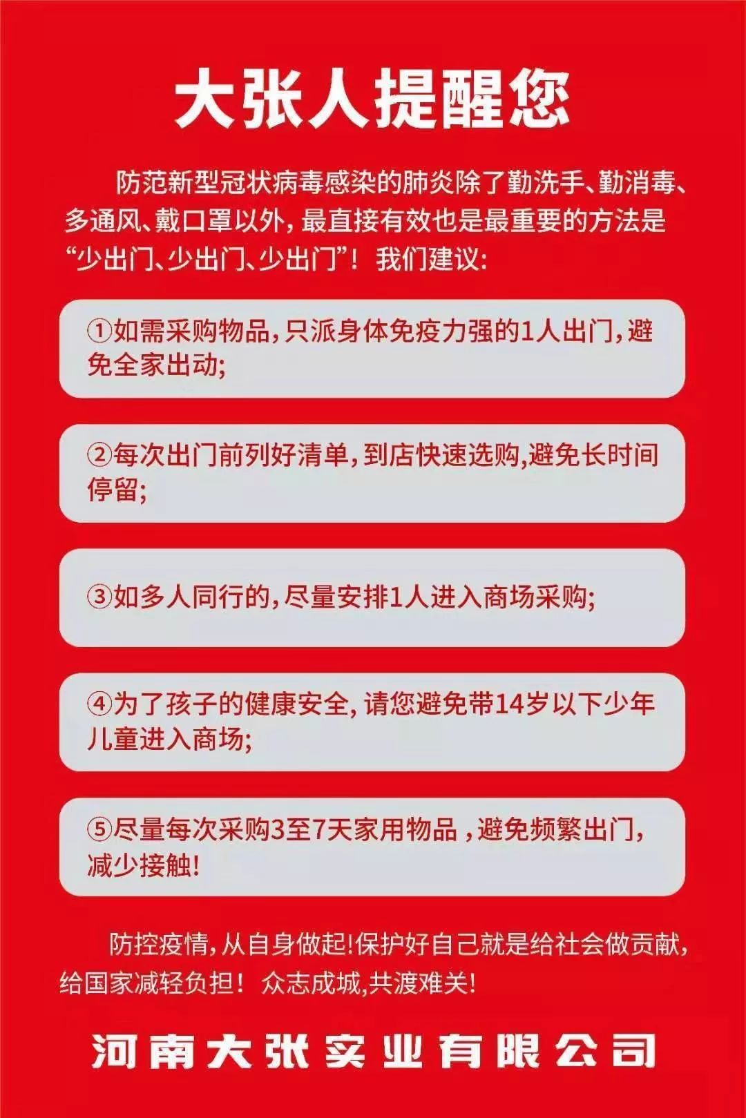 不恐慌、不囤货、理性购物,大张人与您携手同心,让我们坚定信心、团结一致,共克时艰,一定可以战胜疫情!