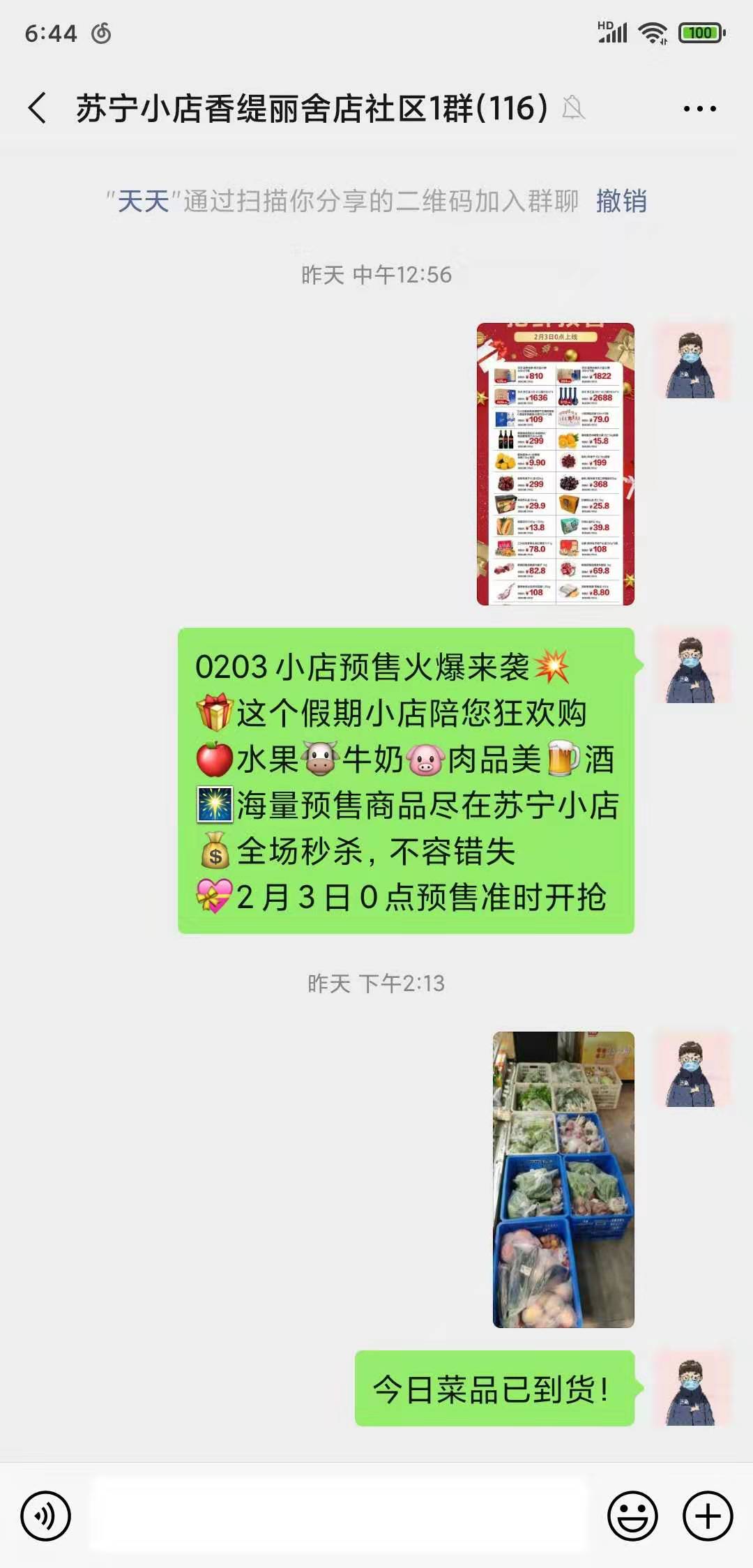 苏宁菜场业务,也是吴永东忙碌的焦点。每天,他都要在微信群里提醒大家到店里拿菜,并推荐性价比高的商品。目前苏宁菜场中,时令蔬菜、肉禽蛋品、海鲜水产,日常所需的菜品都有可选。再加上满减和礼券,性价比算下来也都不错,“社区微信群的总人数比之前增长了一倍多,打电话来询问如何下单和自提的人也越来越多。” 吴永东说。