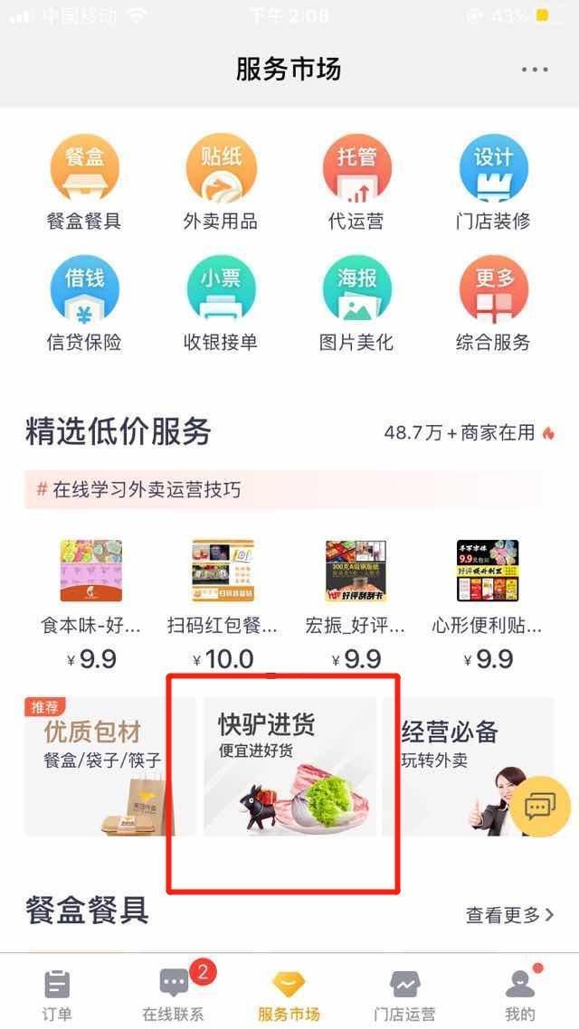 美团旗下餐饮供应链平台快驴进货为外卖合作商户提供“一键开通”在线采购通道,在全国45个城市提供超过5万个商品储备,帮助中小餐饮商户足不出户解决食材问题。