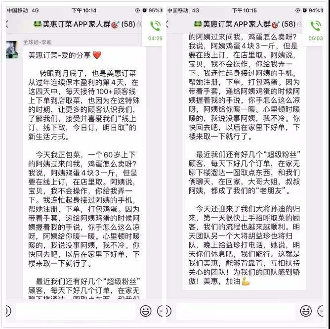 阿姨的一句话,让李迪感动不已,她说,正是因为特殊时期的服务,让更多的顾客认识了美惠订菜,了解了美惠订菜,更接受了美惠订菜“线上订线下取,今日订明日取”的新模式,最近美惠订菜还多了好几个“超级粉丝”,每天手机下好几个订单,取货的时候还得跟李迪他们聊会儿天再走,他们都成为了“老朋友”!