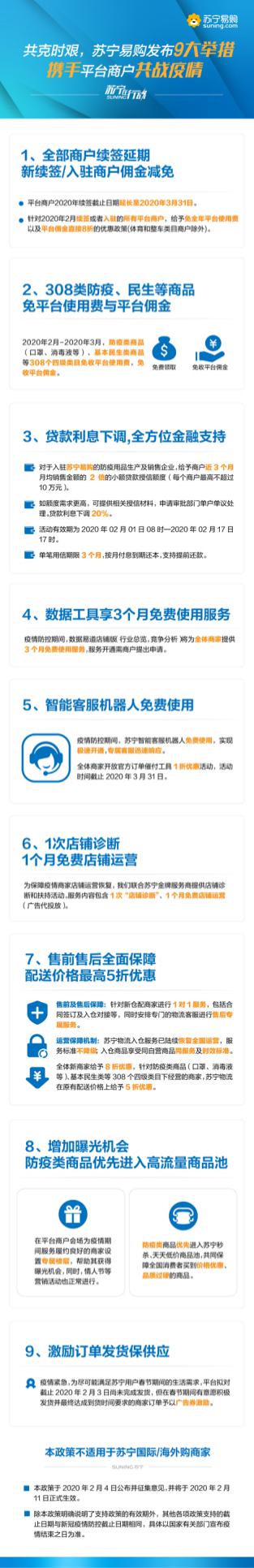 针对这一情况,苏宁易购迅速做出响应,于2月4日针对苏宁云台商户发布涵盖入驻续签、服务支持、资金周转、流量支持等9项支持政策,帮助平台商家减压。