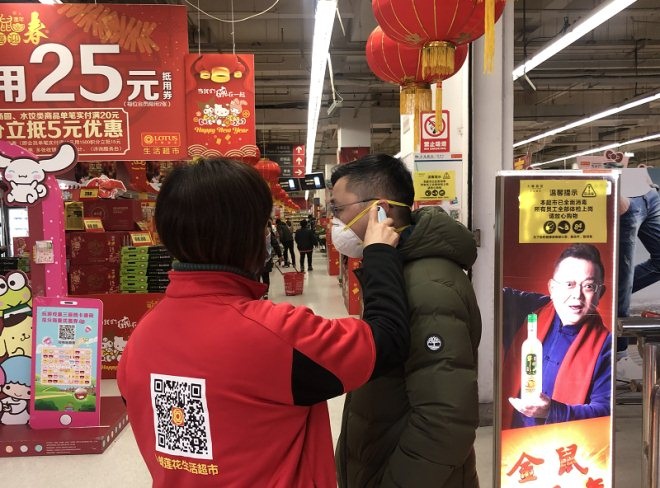 在卜蜂莲花上南路店我们看到,门店员工罗洪粉戴着口罩,正在给顾客认真地测量着体温。同时,在超市储存柜等公共区域都贴上了“已消毒”提示。