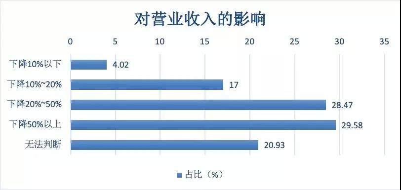 29.58%的企业估计疫情导致2020年营业收入下降幅度超过50%,28.47%的企业预计营业收入下降20%-50%,合计58.05%的企业2020年营业收入下降20%以上。