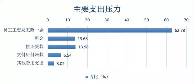 员工工资和五险一金占62.78%,租金13.68%,两项合计76.46%;说明多数小企业员工薪资和五险一金是成本支出的大头,其次是租金;偿还贷款占13.98%,三项合计占90.44%。