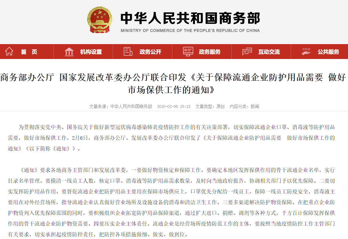 2月6日,商务部办公厅、国家发展改革委办公厅联合印发《关于保障流通企业防护用品需求 做好市场保供工作的通知》。《通知》要求各地商务主管部门和发展改革委,一是要做好物资核定和保障工作,确定本地区发挥保供作用的骨干流通企业名单;二要切实发挥防护用品作用,口罩优先分配给一线员工保障防疫安全,消毒液主要用于营业场所及设施设备的消毒和清洁卫生工作。