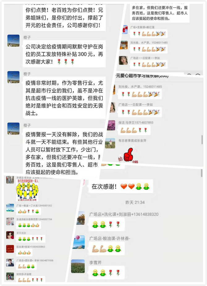 “我深知,在这样的疫情紧张时期,门店的兄弟姐妹每天奋战在一线是有压力的,看了微信群里的这些留言,我真的很受感动。我也有亲人,大家也有亲人,我们今天的付出是为了满足和我们家人一样的那些老百姓的基本生活需求,是为了温暖那些和我们一样拥有的一个个家庭。在这里我代表开元对勇敢战斗在门店一线的兄弟姐妹们表示衷心的慰问和由衷的感谢——感谢你们的付出!感谢你们的勇敢!感谢你们对敬业精神的高度诠释!感谢你们为集团、为社会做出的贡献!我为有你们这样的兄弟姐妹而自豪!我为你们点赞!公司为你们点赞!老百姓为你们点赞!兄弟姐妹们,是你们的付出,撑起了开元的社会责任,公司感谢你们!”乌兰图雅总经理以文字的形式吐露了自己的心声。