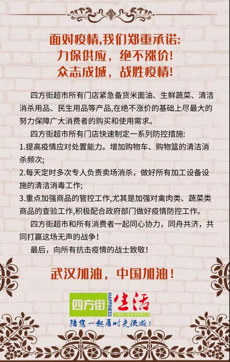 疫情防控刻不容缓,我们呼吁顾客加强防范,出门佩戴口罩,日常勤洗手;咳嗽或打喷嚏捂住口鼻;将肉蛋彻底做熟。我们万众一心、众志成城,坚信一定能够打赢这场疫情防控战!