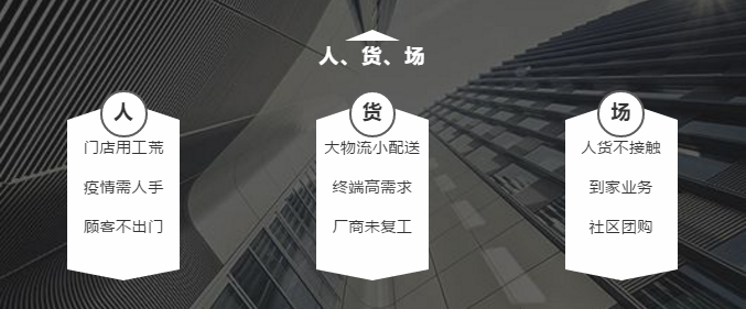 从员工角度来讲,在疫情+春节双重因素影响下,“用工荒”显然成为影响“人、货、场”闭环连接的阻碍因素。同时用工成本的上升和经营业绩的下降,让这种局面更加困难。“共享员工”计划在于短期内解决了“歇业企业”的员工成本,同时解决了“营业企业”特别超市类服务企业的“用工荒”。